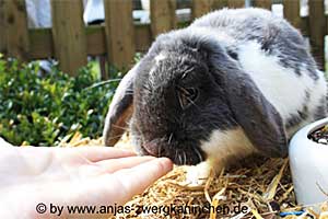 Eine zu frühe Trennung vom Muttertier und der gewohnten Umgebung ist eine große Belastung für das kleine Kaninchen. Es fehlt ein großer Teil der Prägung, denn alles Wichtige lernt der Zwerg in den ersten Wochen von seiner Mutter. Um im späteren Leben zu Recht zu kommen, sind die ersten Wochen die wichtigste. Eine ordentliche Aufzuchtphase beim Muttertier sollte min. bis zur 8. Lebenswoche andauern. Bei uns verlassen die kleinen Ihre Mama sogar erst in der 10. Lebenswoche.